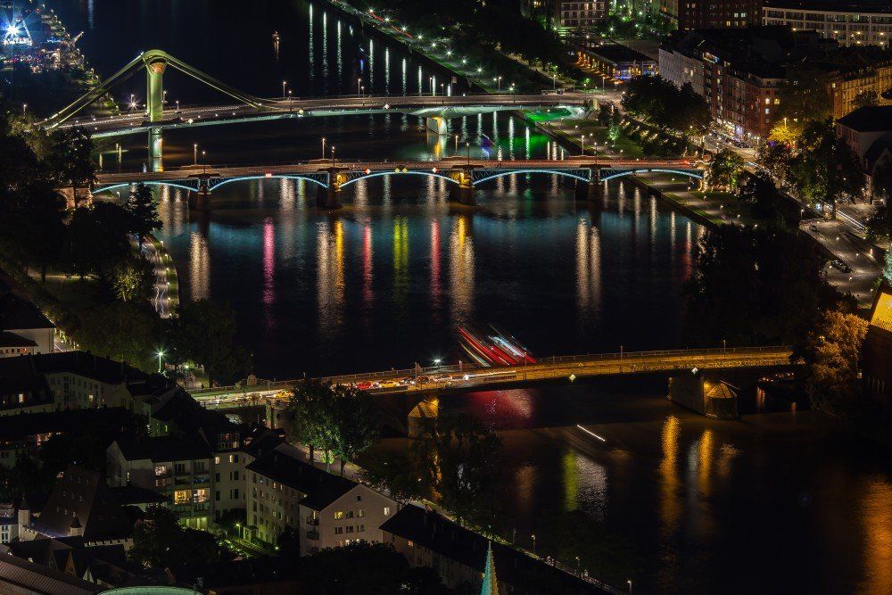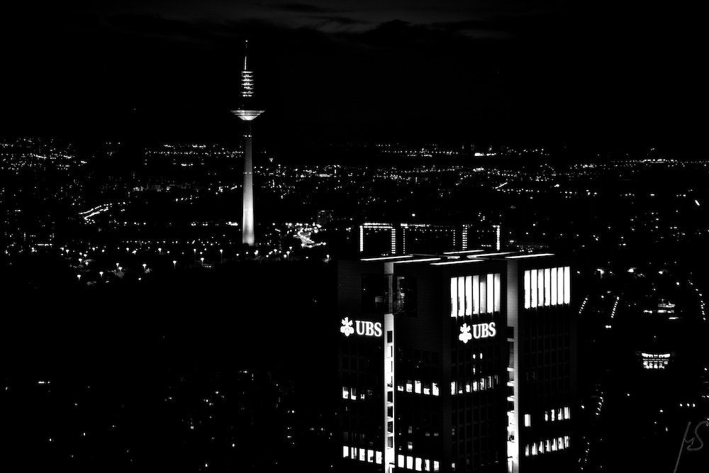 - Zu guter letzt sind wir dann noch zum HeLaBa-Gebäude (Main-Tower)gefahren um Nachtaufnahmen der Großstadtkulisse zu machen. Der Turm ist 53 Stockwerke (190m) hoch, man hat von dort aus eine grandiose Rundum-Sicht über die ganze Stadt und deren Umland. Bis zum Schliessen der Besucherterrasse um 23:00 haben wir überwiegend mit Teleobjektiven vom Stativ aus eine Reihe von beeindruckenden Aufnahmen machen können.