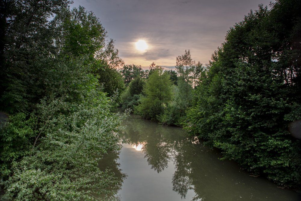 Zunächst benutzten wir einen neutral-grauen Verlaufsfilter um die Helligkeit des Abendhimmels beim Sonnenuntergang der dunkleren Flusslandschaft anzupassen, anschliessend benutzten wir ND-Filter verschiedener Dichten um das (spärlich) fliessende Wasser am Stauwehr mit einer gewissen Dynamik darzustellen.