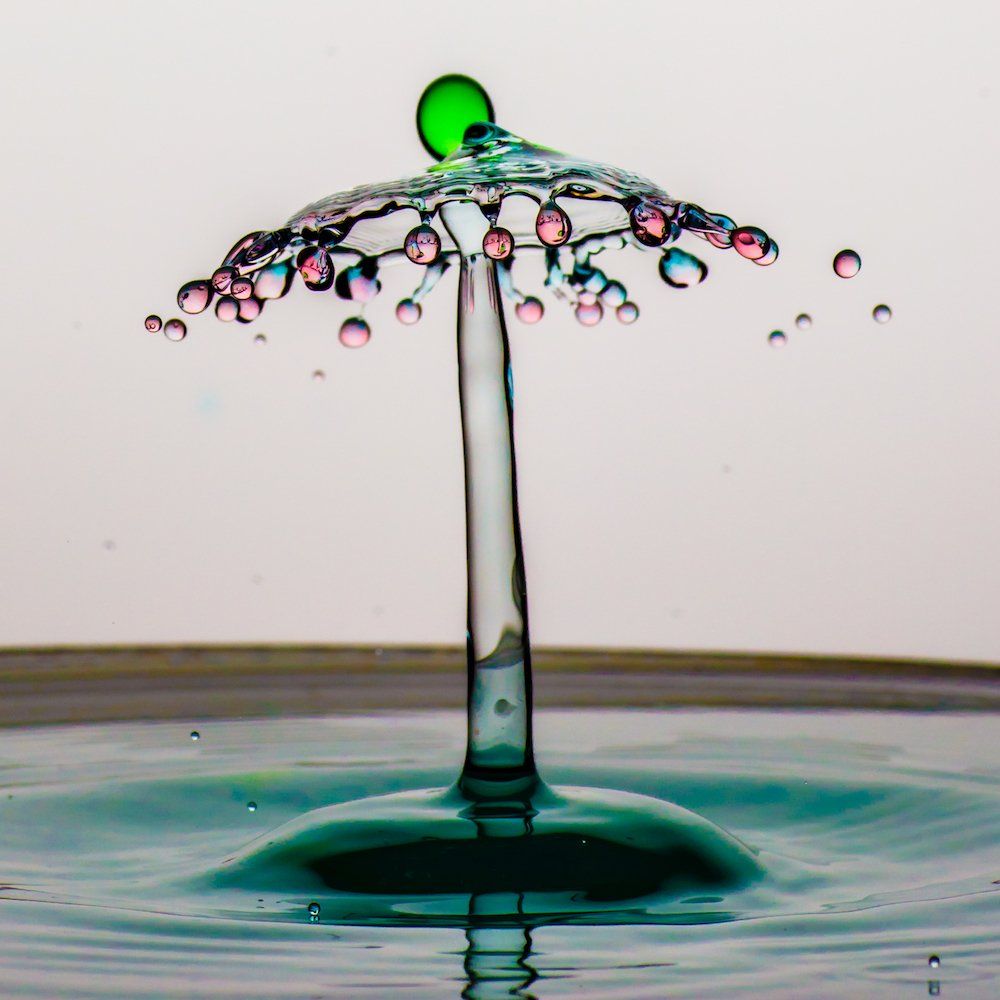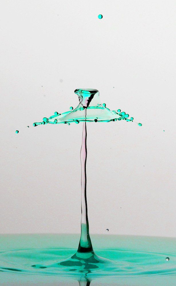Dieser Tropfen bildet beim Auftreffen auf die Säule die “Schirmchen”, die wir in den Aufnahmen sehen. Die Fotos entstanden in vollständiger Dunkelheit, die Kamera wurde im “Bulb-Modus” ausgelöst - und in diesen offenen Verschluss wurde hinein geblitzt.