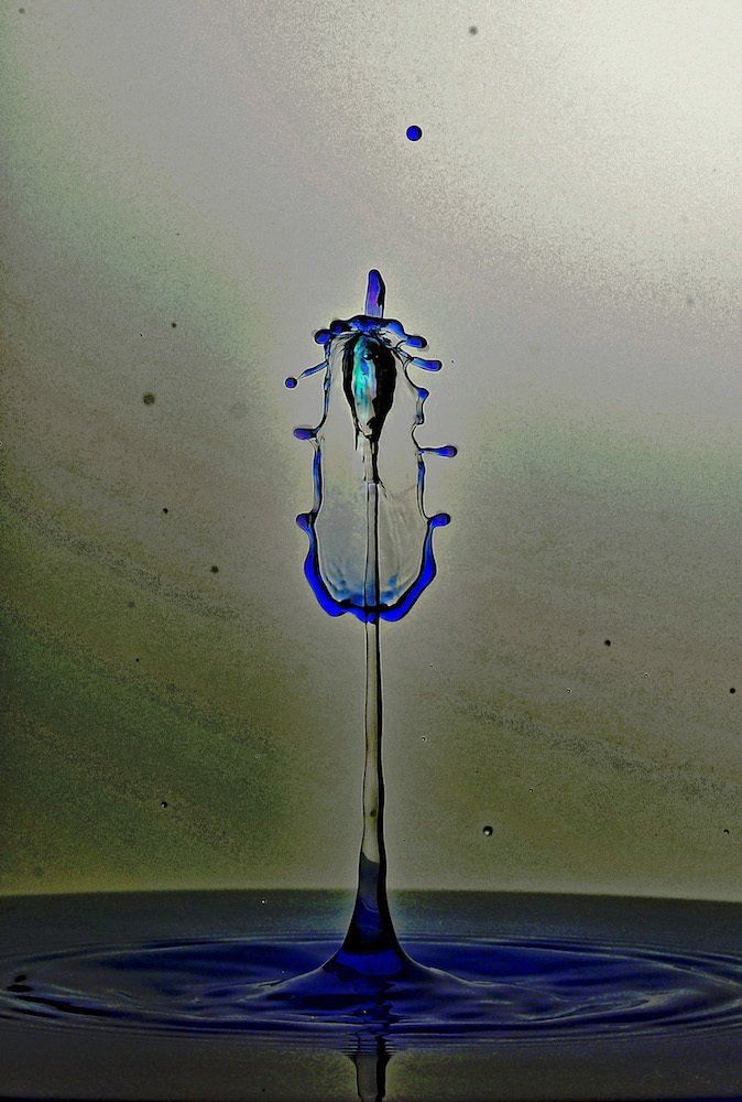 Dietmar hat die entsprechenden Vorbereitungen getroffen (Magnetventile, Zeitsteuerung, Blitzanlage und nicht zuletzt die eigefärbten Flüssigkeiten mit der richtigen Viskosität) so, dass wir zügig loslegen konnten. Der grundsätzliche Ablauf dabei war so, dass zwei Tropfen unmittelbar hintereinander ausgelöst eine hohe Wassersäule erzeugen auf die wir dann zum richtigen Zeitpunkt einen dritten Tropfen fallen liessen.