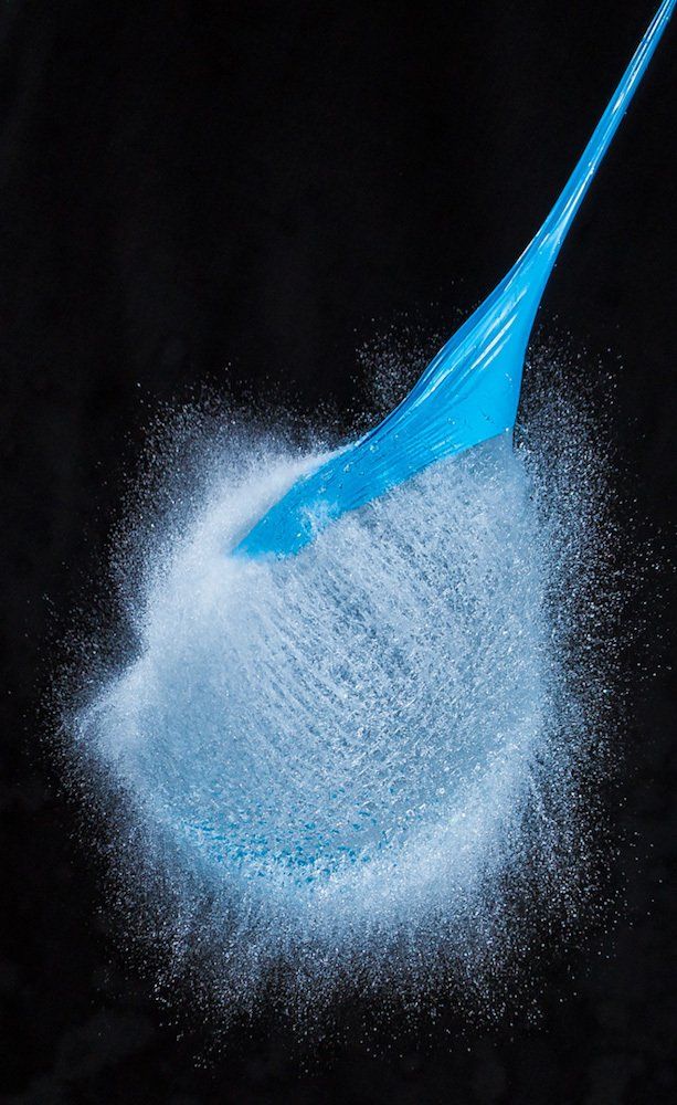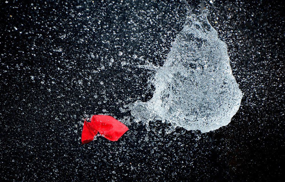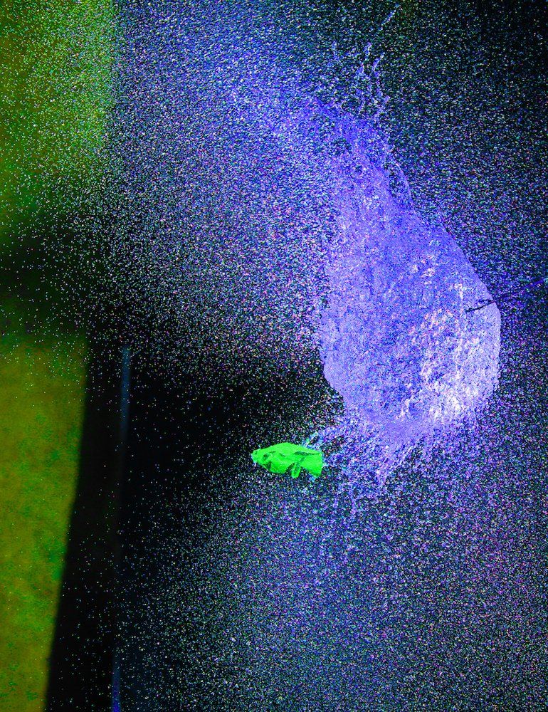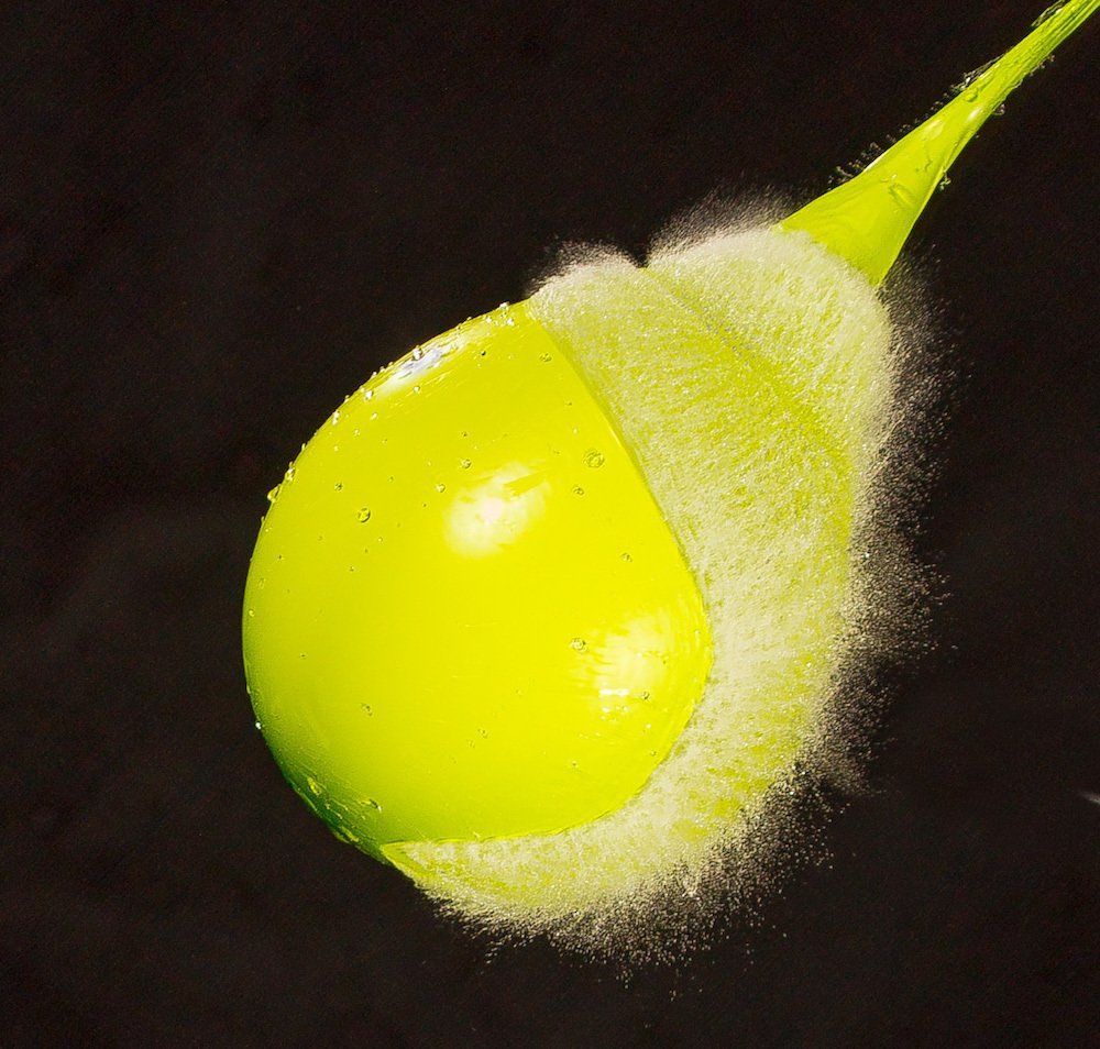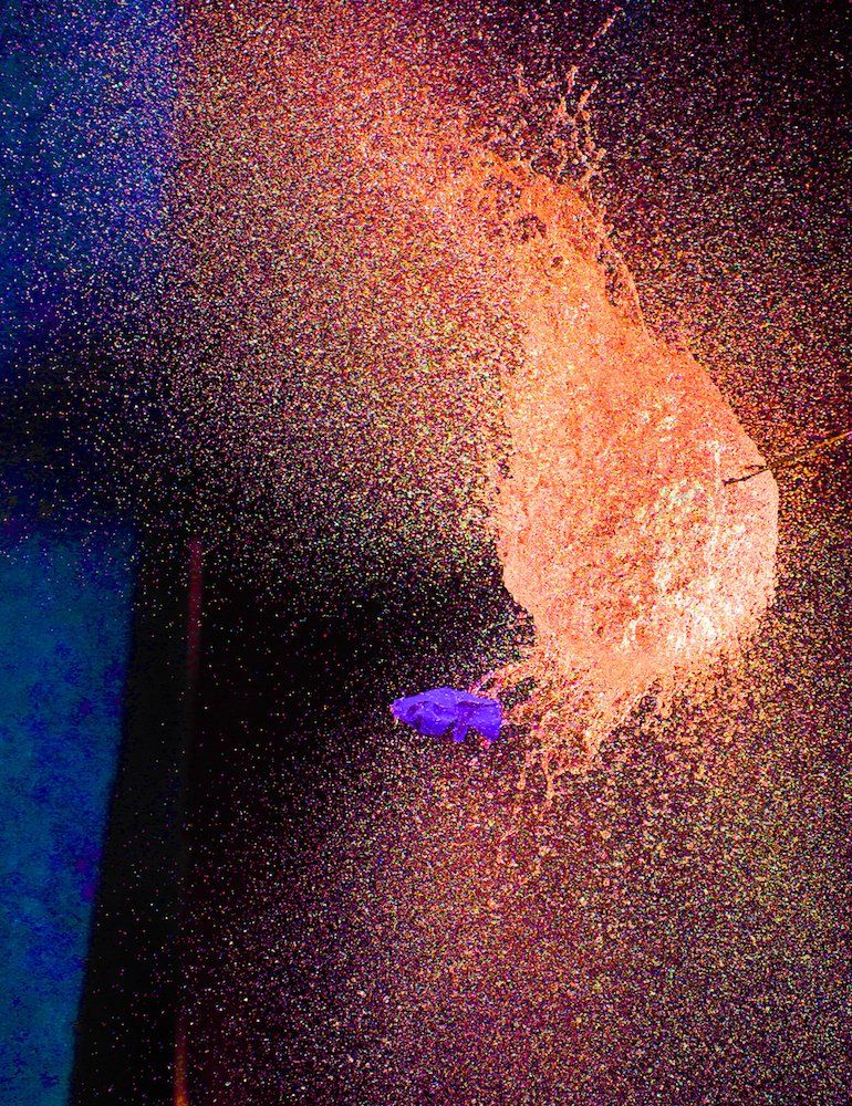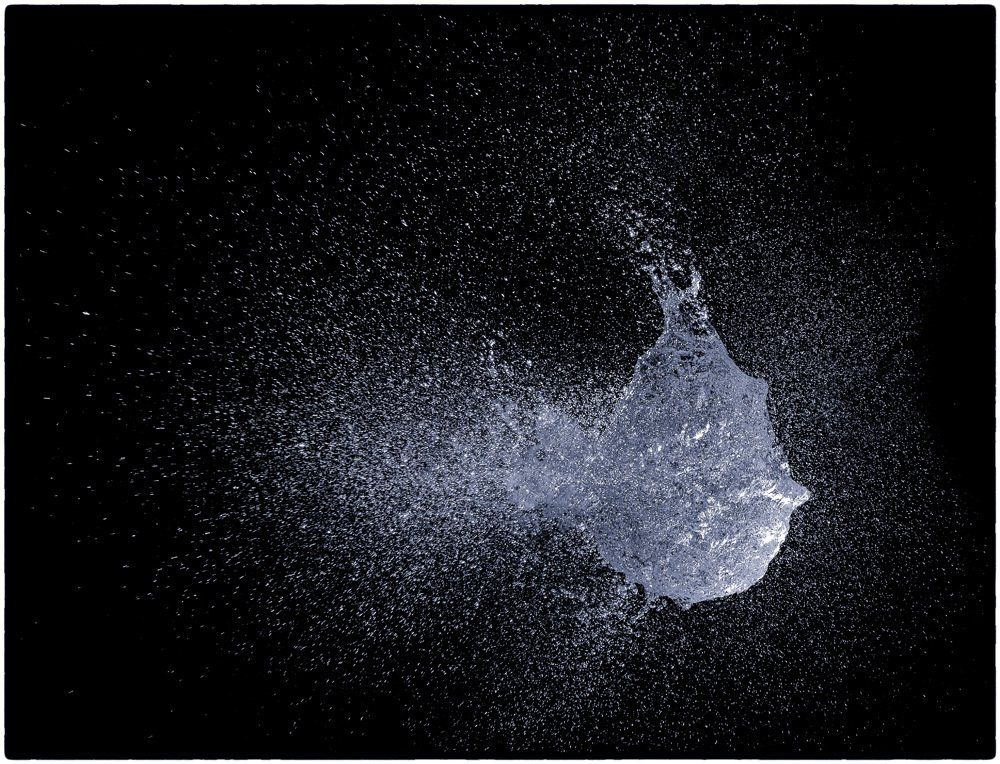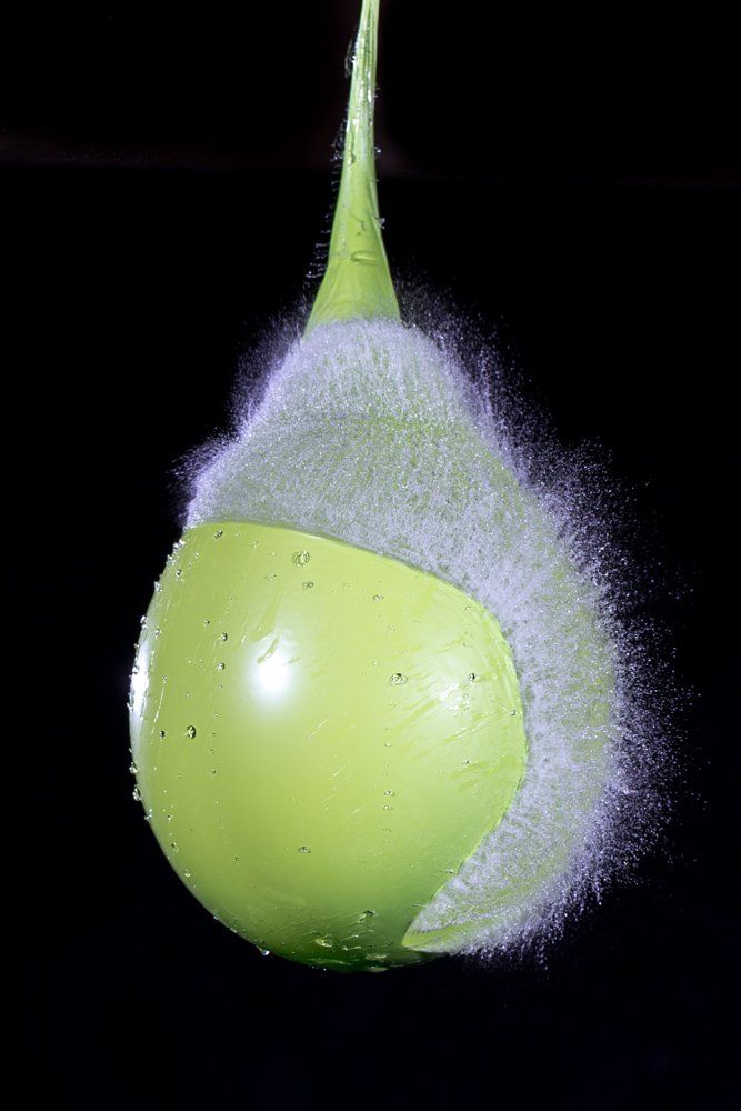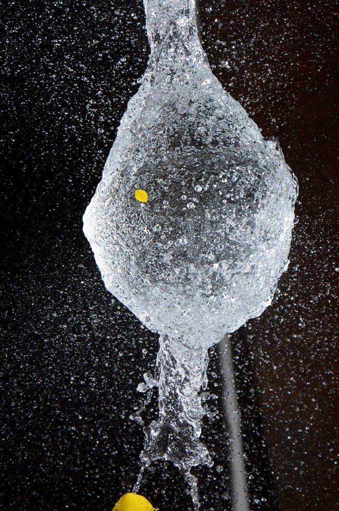 Dietmar kam auf die Idee mit Wasser gefüllte Luftballons zu fotografieren - und zwar genau in dem Augenblick, in dem sie von einer Nadel gestochen platzen. Wir fotografierten im Dunkeln, die Blitze wurden durch einen Kontakt in der Nadel ausgelöst.