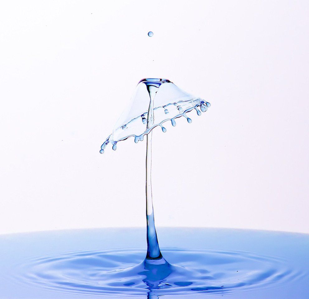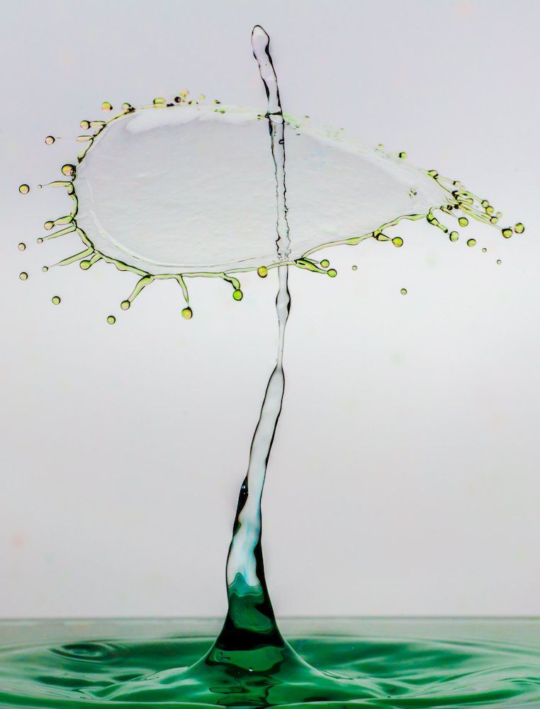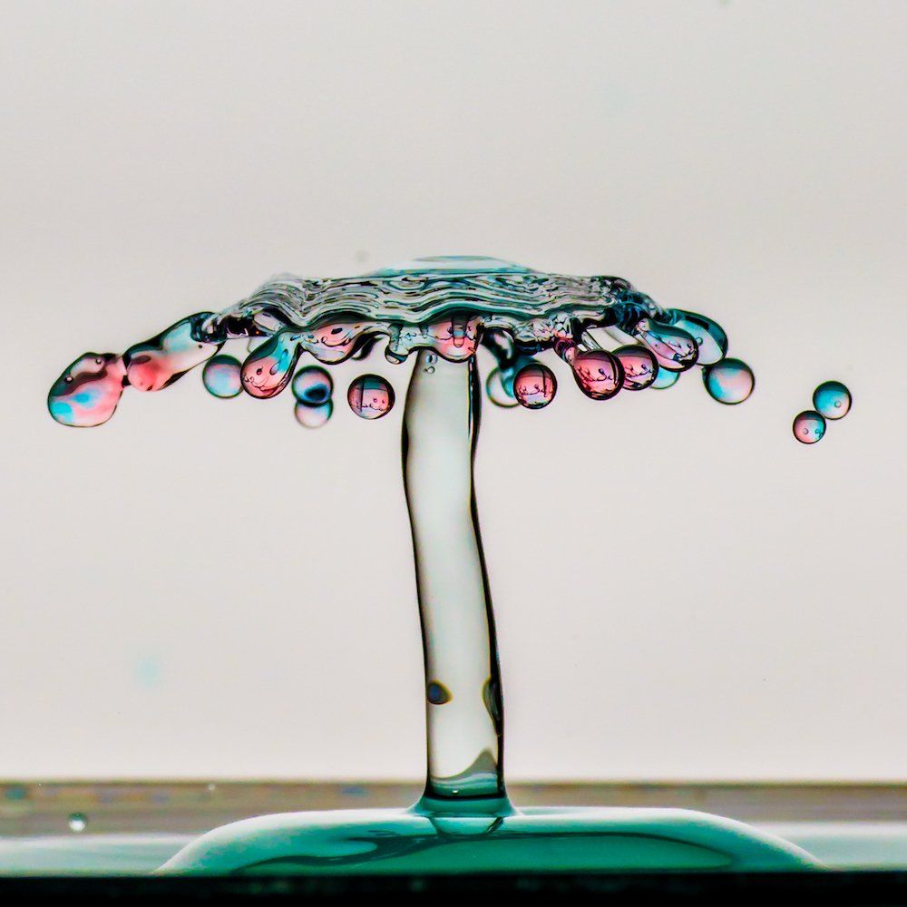 Dieser Tropfen bildet beim Auftreffen auf die Säule die “Schirmchen”, die wir in den Aufnahmen sehen. Die Fotos entstanden in vollständiger Dunkelheit, die Kamera wurde im “Bulb-Modus” ausgelöst - und in diesen offenen Verschluss wurde hinein geblitzt.