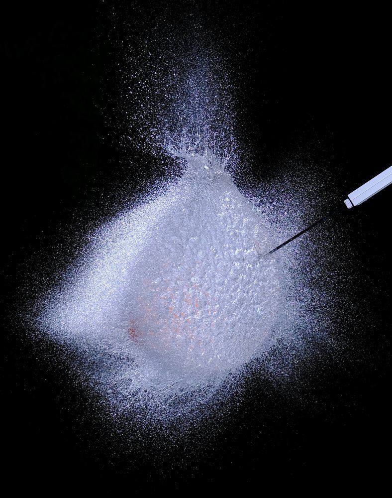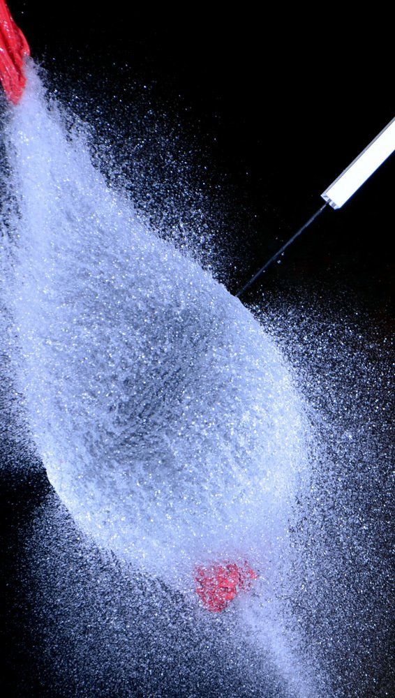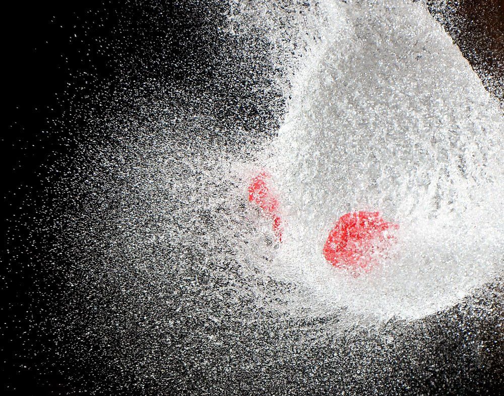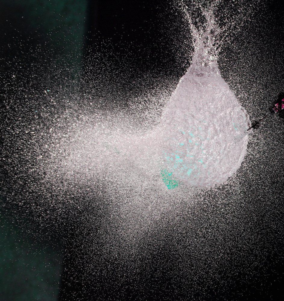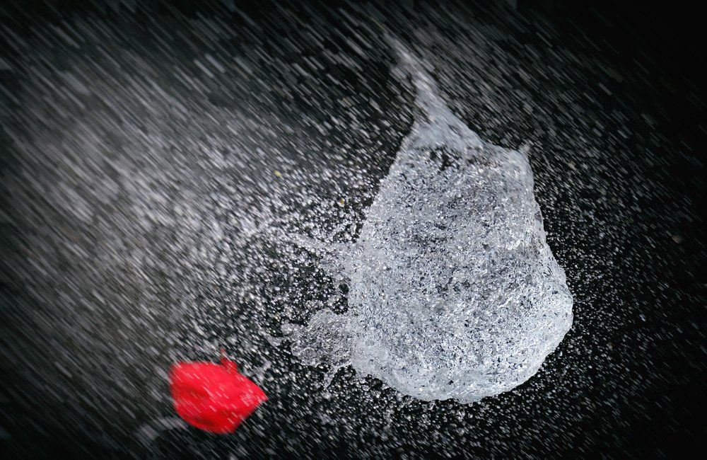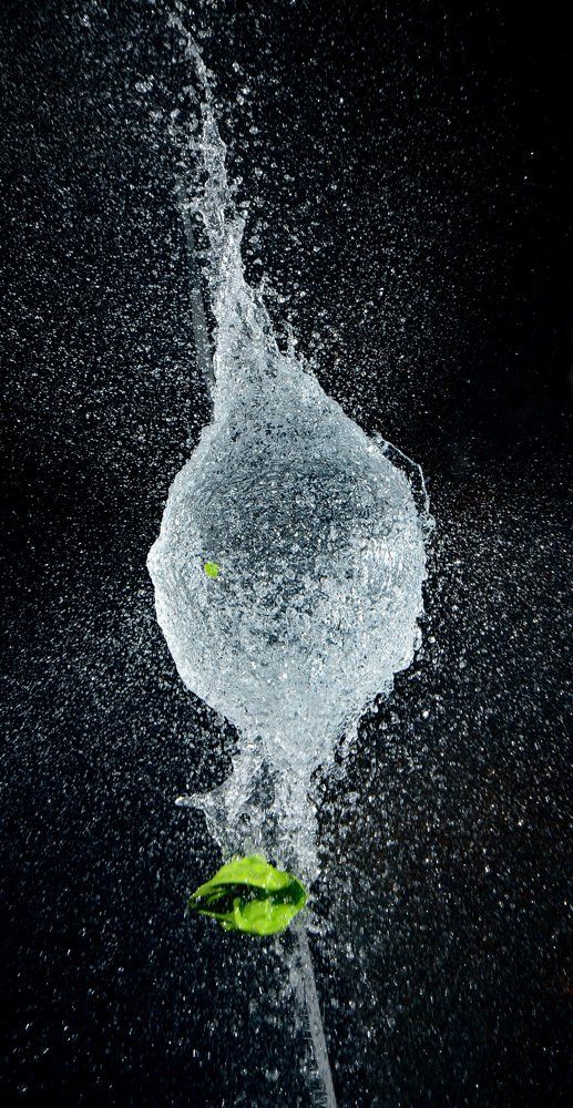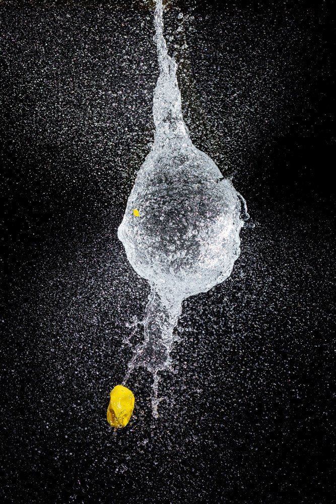 Dietmar kam auf die Idee mit Wasser gefüllte Luftballons zu fotografieren - und zwar genau in dem Augenblick, in dem sie von einer Nadel gestochen platzen. Wir fotografierten im Dunkeln, die Blitze wurden durch einen Kontakt in der Nadel ausgelöst.